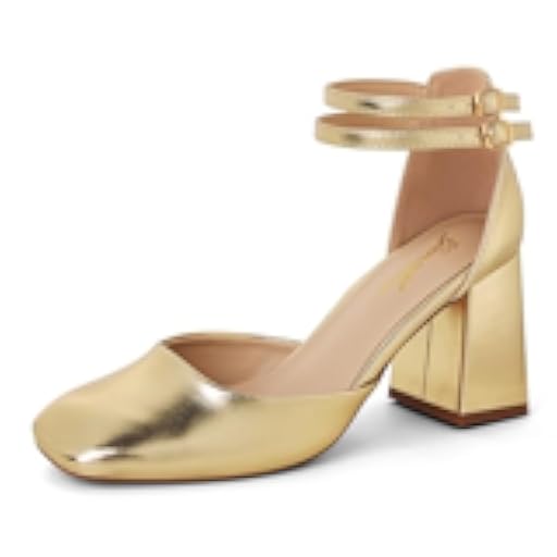 GENSHUO Zapatos de Tacón Grueso para Mujer, Doble Correa al Tobillo, Punta Cuadrada, Tacones Elegantes y Cómodos para Vestimenta Formal, Oro Mate, 42 EU